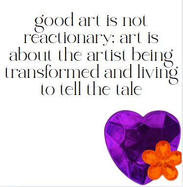 At the end of the day, good art is not reactionary. It has to come from internal alchemy; art is about the artist being transformed and living to tell the tale, and the viewer/listener/audience being moved by the experience of interacting with the art. But there is the secret - the intent cannot be “to move.” The intent is to display the beat of your heart at the moment you were changed, in the best language or medium you can use. Your raw emotions, experiences, and ideas are what make people feel like you’re (to borrow from Roberta Flack) reading the audience’s letters aloud. And that cannot come from centering the audience in your work.