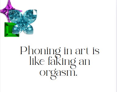 Phoning in art is like faking an orgasm. It might fool some people, but it’s not going to fool everyone. We can always tell when art is inauthentic, half-baked, capitalistic art. It’s like a mass-produced TJ Maxxx Art piece vs a one-of-a-kind.
